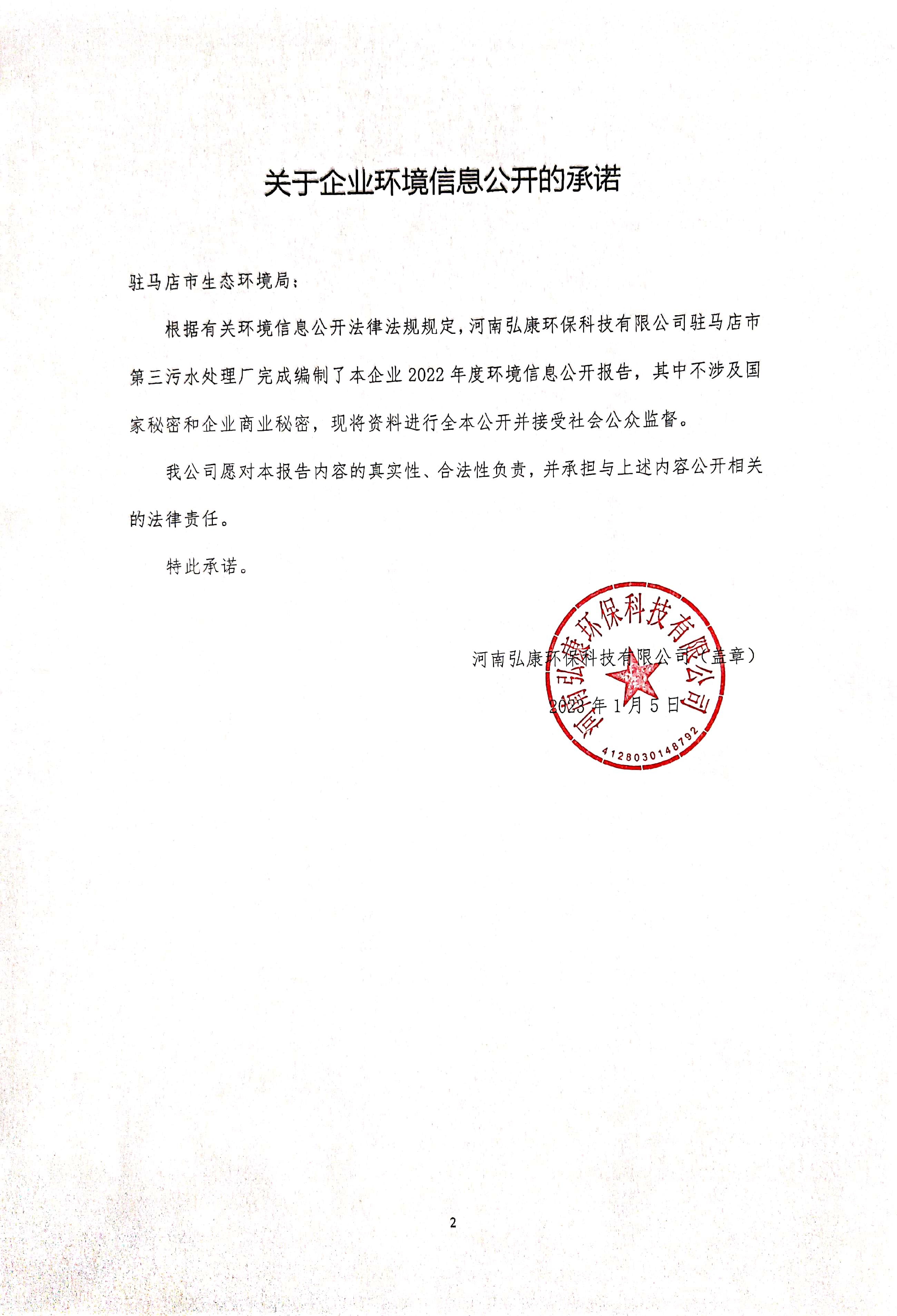 河南弘康環(huán)保科技有限公司駐馬店市第三污水處理廠2022年度環(huán)境信息公開報(bào)告